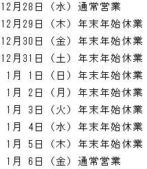 2022年12月15日 協和車輌 年末年始休業日及び休業日の緊急対応 新着情報 2022.12.15 <年末年始休業日のご案内> <休業日の緊急対応について> カーレスキュー(有)ハセガワ重建車輌(24時間対応) 永平寺(営):0776ー63-3548 高木本社:0776ー53-8934 日新火災サポートサービス(24時間対応) <事故のご相談>:0120-25-7474