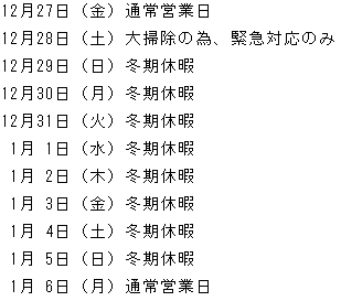 2024年12月12日 協和車輌 年末年始休業日及び休業日の緊急対応 新着情報 2024.12.12 <年末年始休業日のご案内> <休業日の緊急対応について> カーレスキュー(有)ハセガワ重建車輌(24時間対応) 永平寺(営):0776-63-3548 高木本社:0776-53-8934 日新火災サポートサービス(24時間対応) <事故のご相談>:0120-25-7474